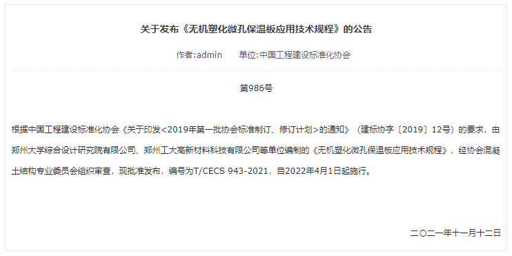 由鄭州大學(xué)綜合設(shè)計研究院有限公司、我司主編,中國建筑科學(xué)研究院有限公司等十七家單位參編的《無機(jī)塑化微孔保溫板應(yīng)用技術(shù)規(guī)程》(以下簡稱:《規(guī)程》)近日發(fā)布,自2022年4月1日起施行。